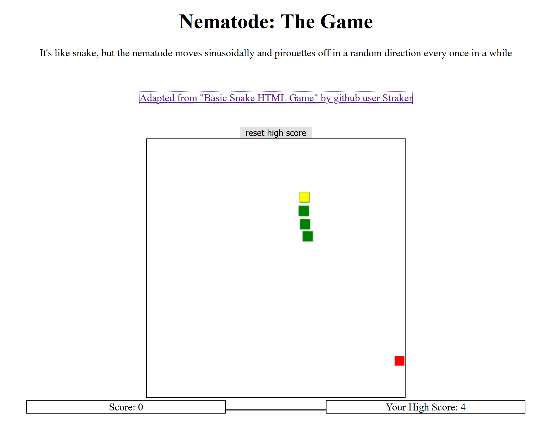 Bennet was inspired by C. elegans locomotion, and built the “Nematode Game”! It’s like snake, but the nematode moves in a sinusoidal way and pirouettes off in a random direction every once in a while-so it can be harder than you think!